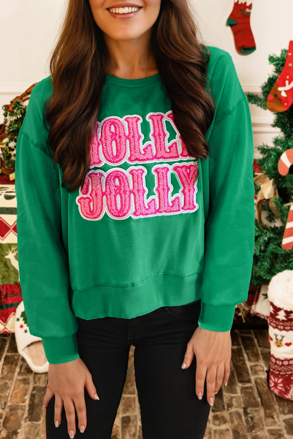 This green Christmas sweatshirt is festive with HOLLY JOLLY towel embroidered patched.