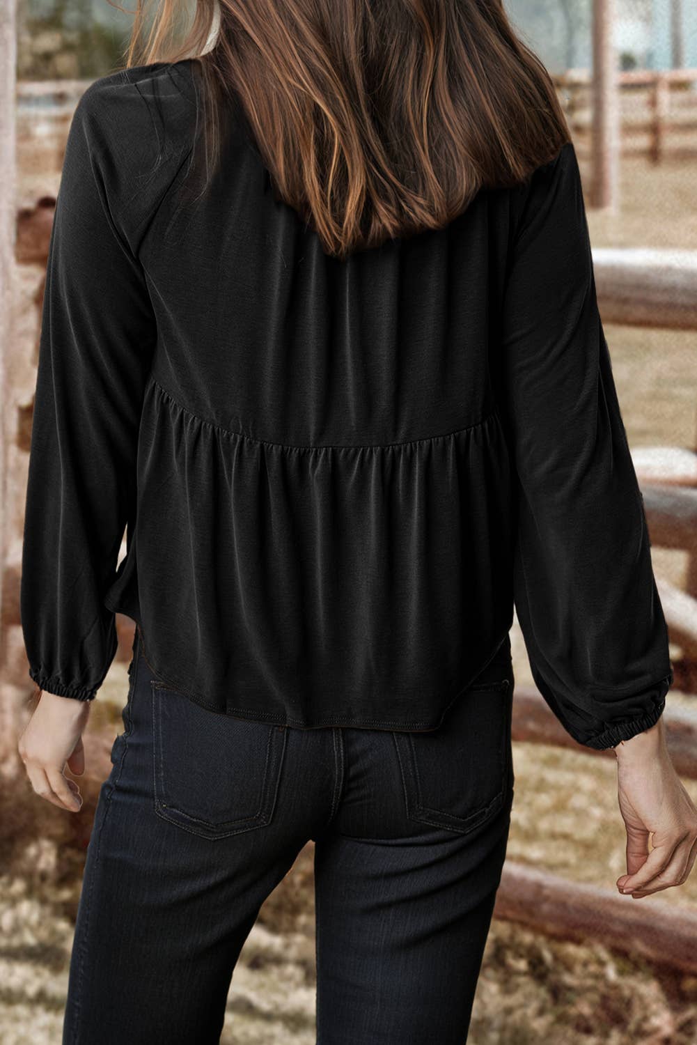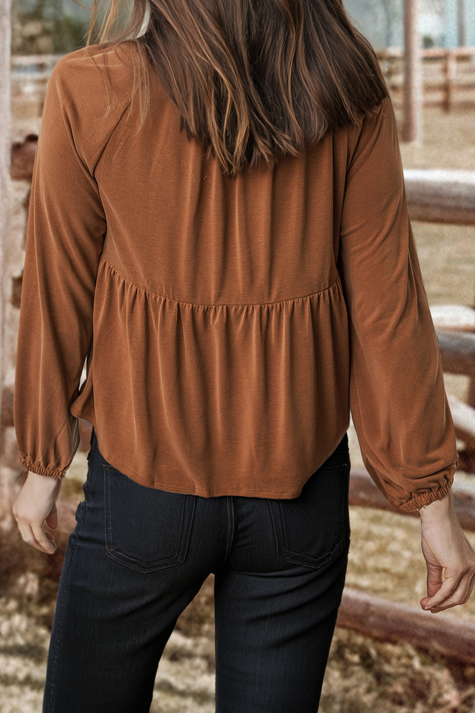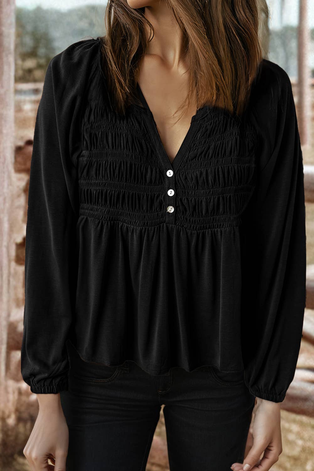 🌺Material: 93%Viscose+7%Elastane 🌺Pattern: Solid 🌺Neckline: V Neck 🌺Sleeve: Long sleeve 🌺Details: Shirred,Button 📏Size Chart(INCH) | Size | Bust | Waist | Hem Width | Sleeve Length | Length | |-------|-Relax-|-Relax-|------Relax-----|-------Relax-------|--Relax--| | S | 33.9 | 31.9 | 55.1 | 27.8 | 22.0 | | M | 36.2 | 34.3 | 58.3 | 28.3 | 22.8 | | L | 38.6 | 36.6 | 61.4 | 28.9 | 23.6 | | XL | 41.7 | 39.8 | 65.4 | 29.6 | 24.4 | Stay comfortable all day in this split V-neck blouse. Elevate your style with a smocked bust design. Versatile piece with long sleeves and a flow fit for any occasion. Style with pants, jeans, shorts, or a skirt for a complete outfit.