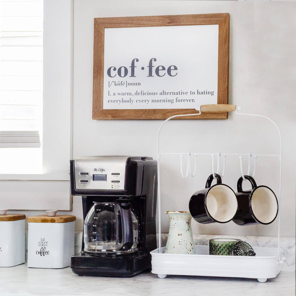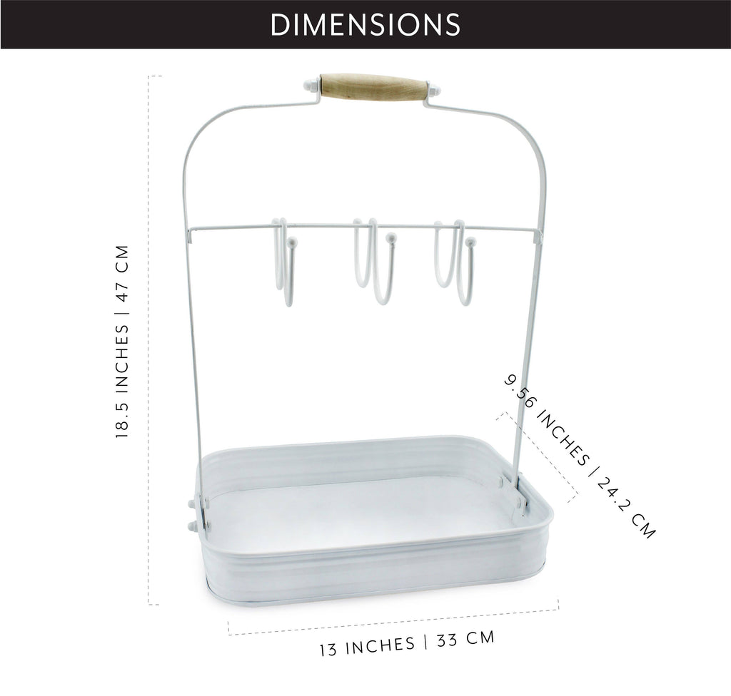 Our white enamelware over galvanized iron coffee caddy is durable, sturdy, and long lasting. Will go well with any retro or primitive style décor. Perfect for home or office - countertop or coffee bar organizer. Our coffee organization tray comes with a hanging coffee mug rack, which holds three coffee mugs on each side - 6 total mugs. Super cute, convenient, and easy to clean. This is perfect for minimizing clutter while displaying your favorite mugs. FEATURES: Large Size: 13" long x 9.6" wide x 18.5" tall Weight: 2.6lbs Material: Enamel over galvanized iron with wooden handle grip Color: Distressed white with natural wood handle grip CARE INSTRUCTIONS: Hand wash only Use a mild detergent and non-abrasive cloth.