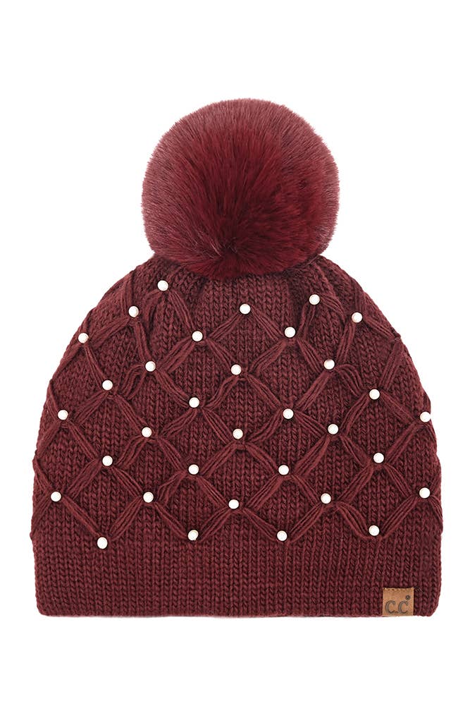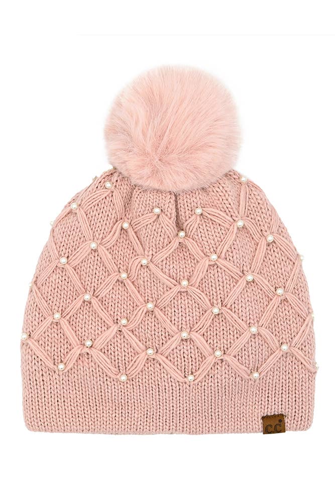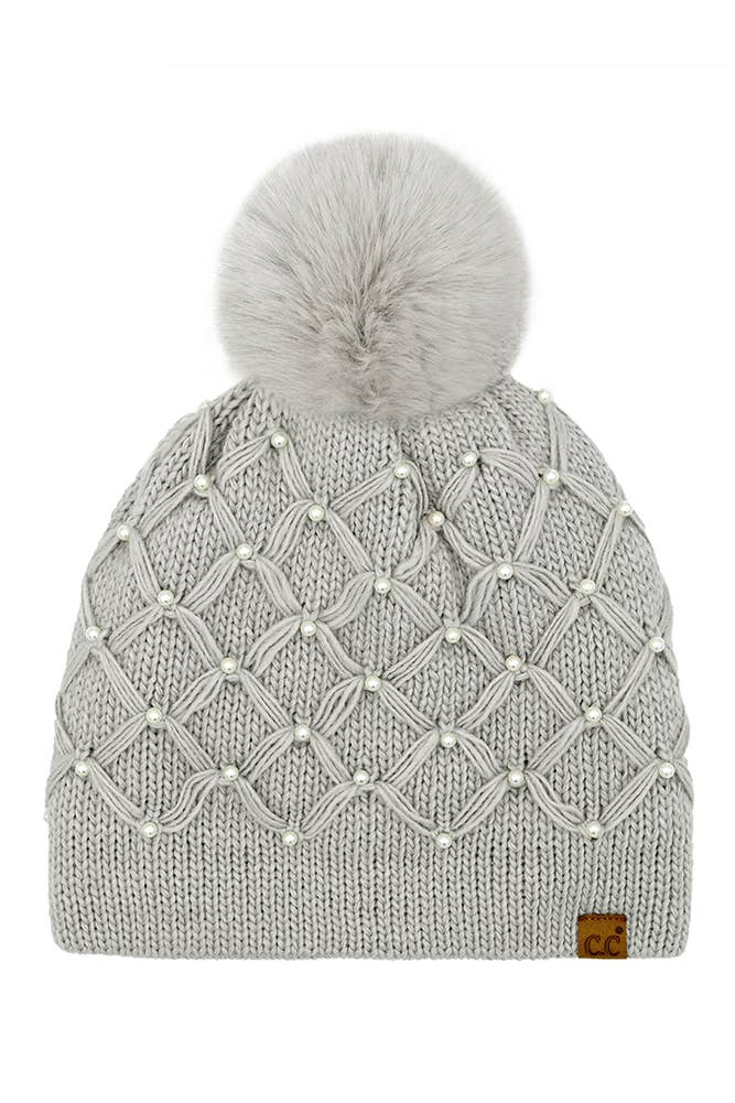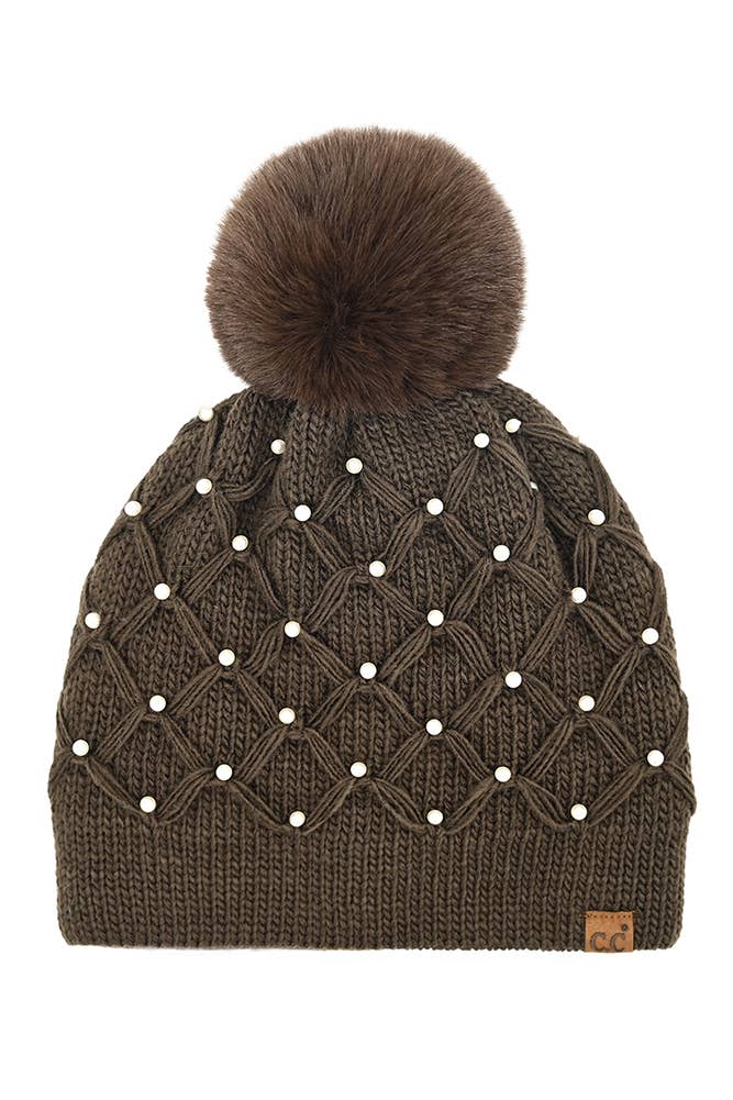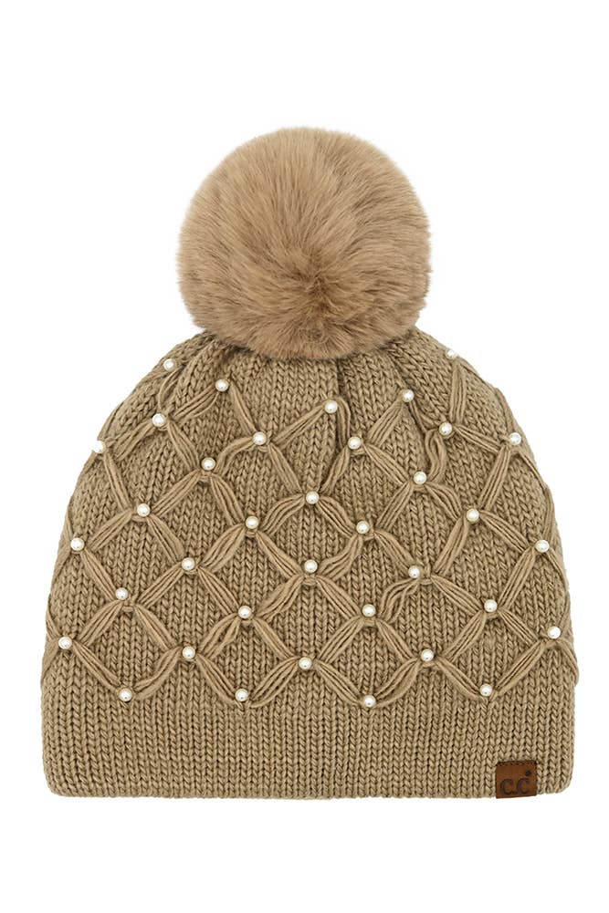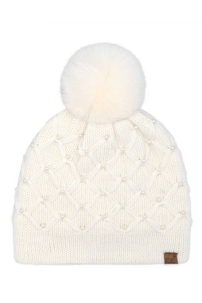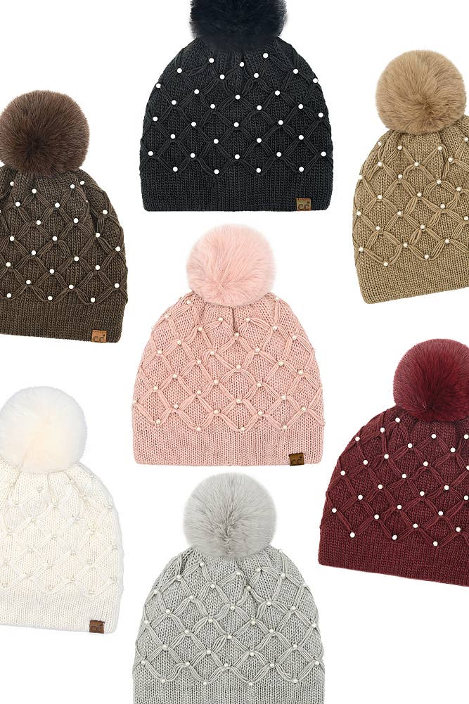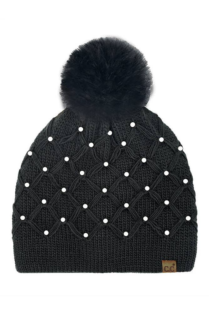 C.C Allover Pearl Crochet Pom Beanie Winter Hat