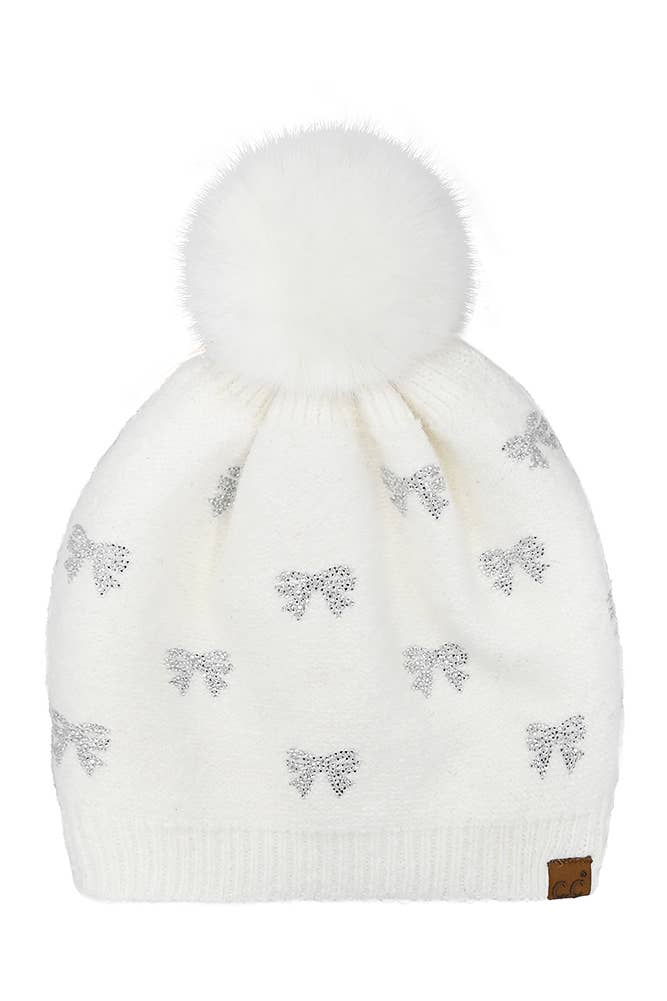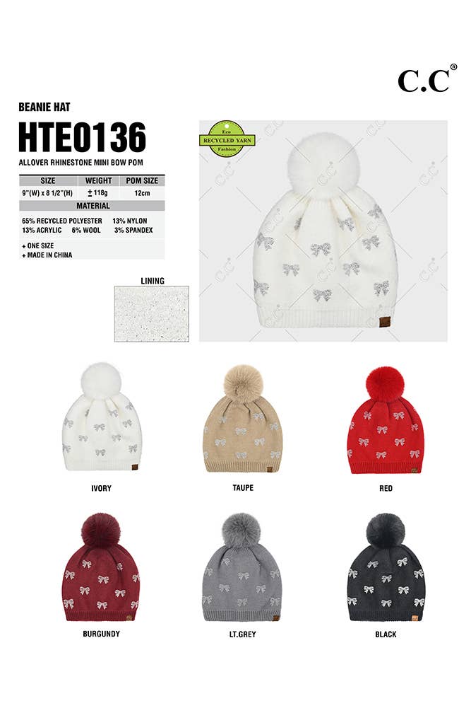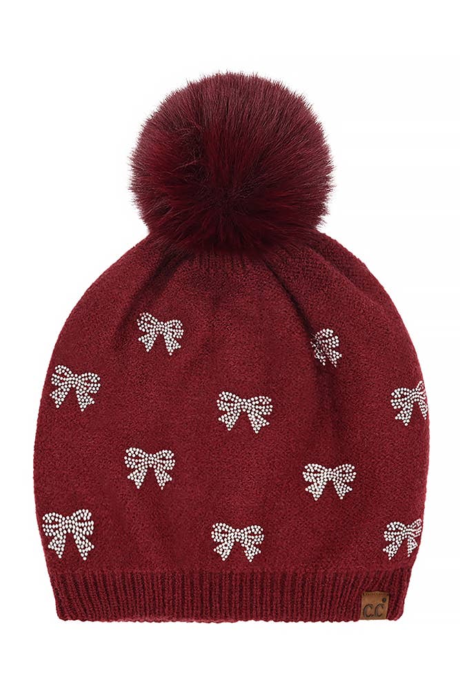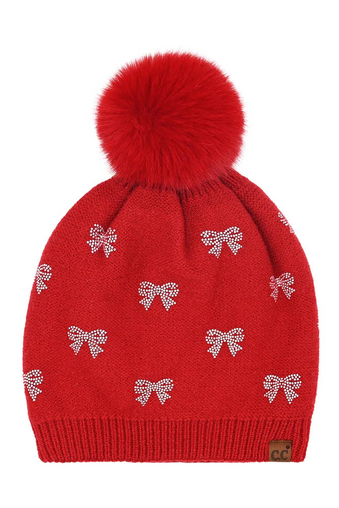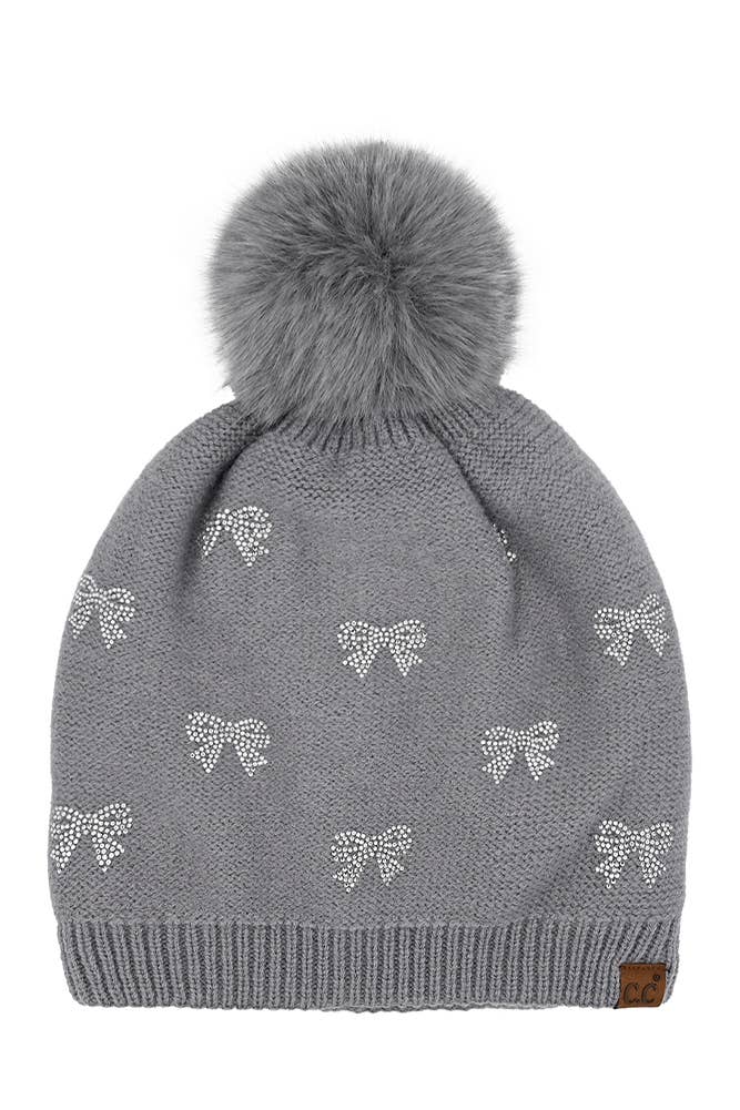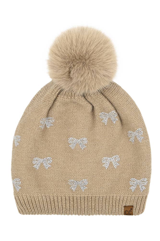 C.C Allover Rhinestone Mini Bow Pom Beanie Winter Hat