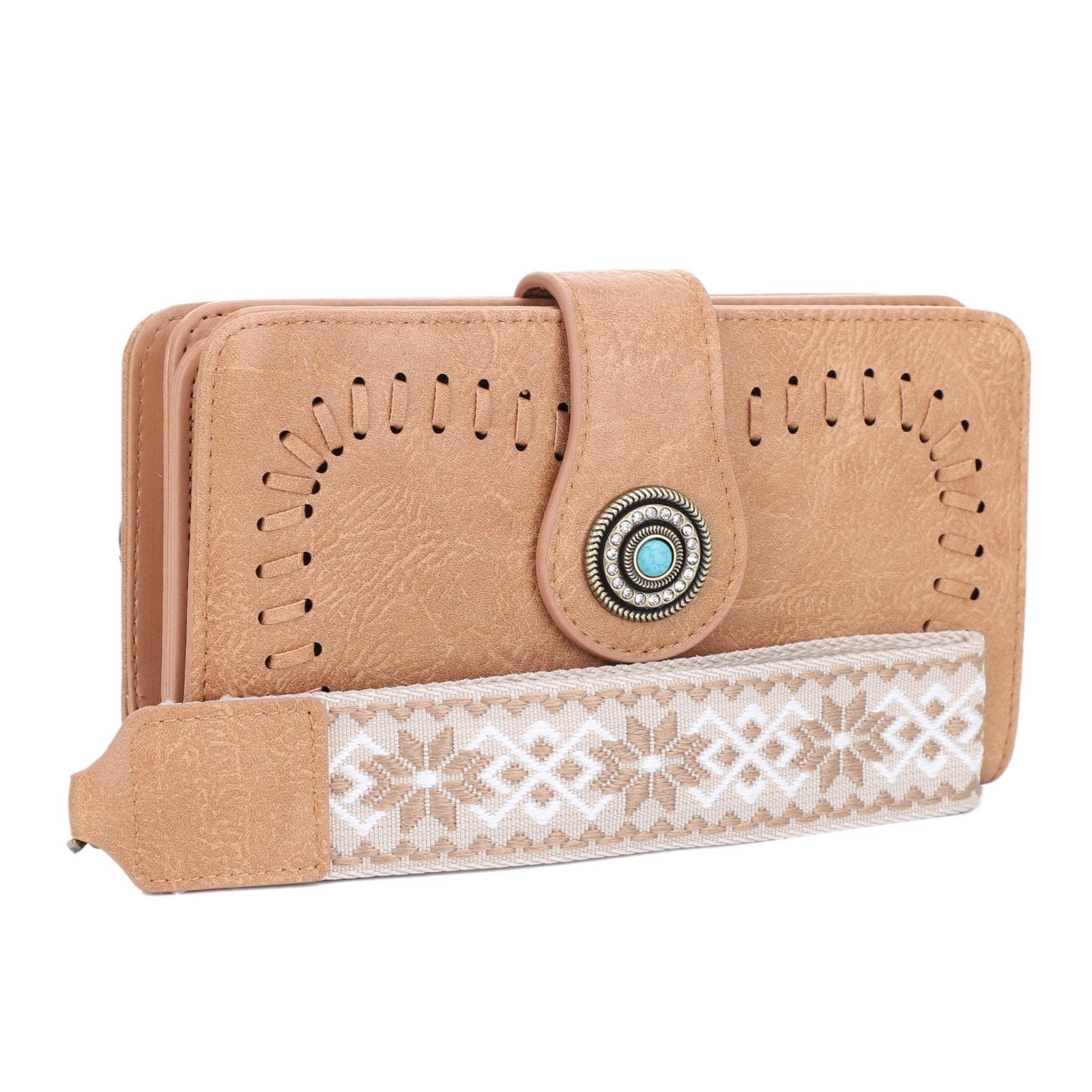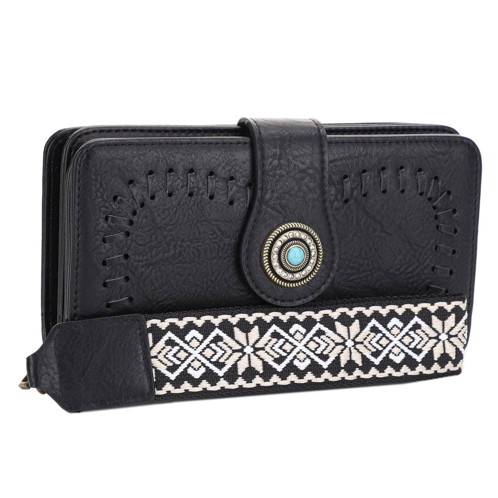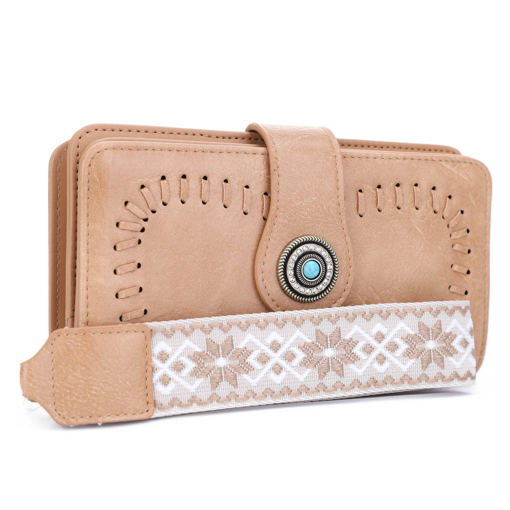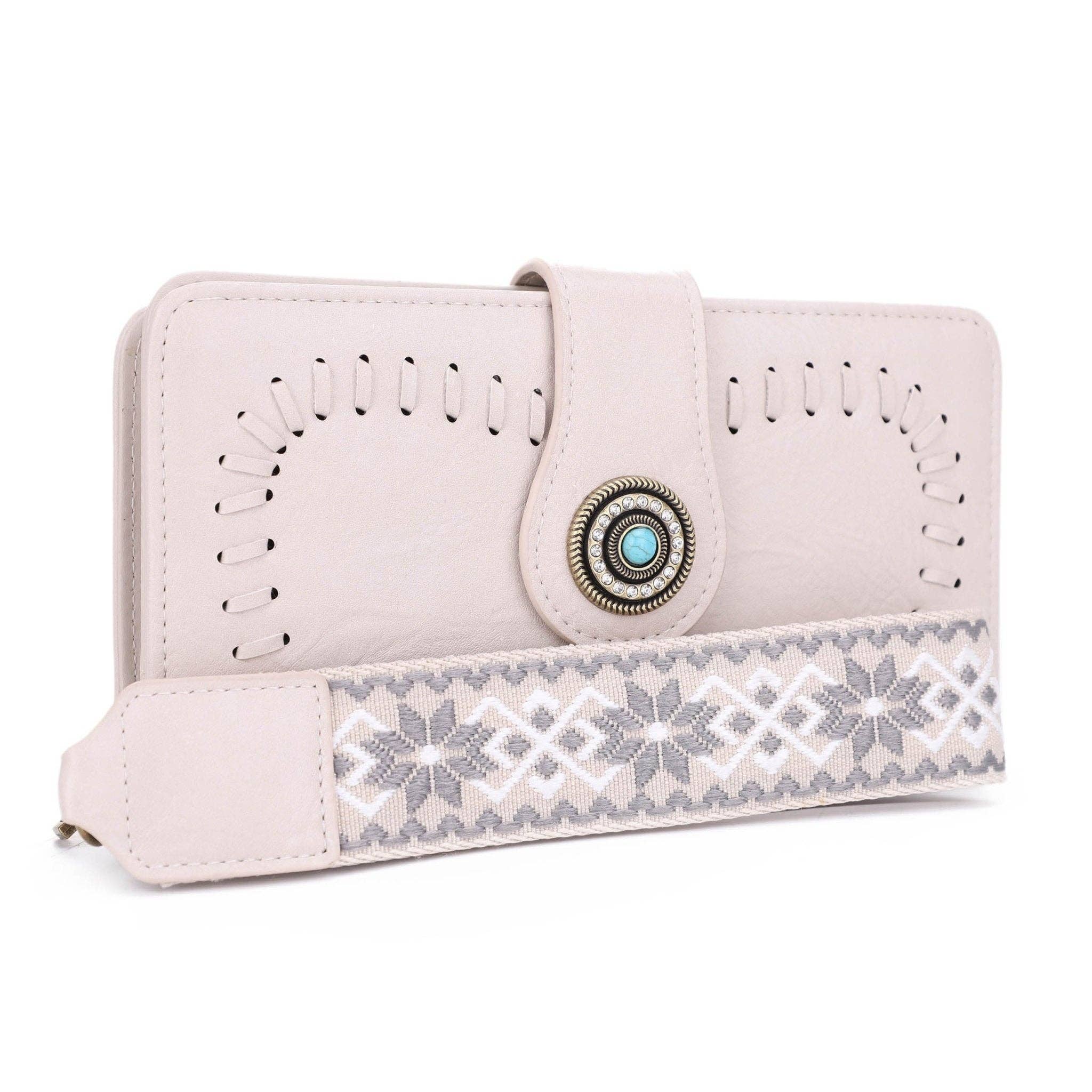 Make a statement with the ES60166 Dolly Western Wallet! With a detachable Boho wristlet strap and plenty of room for all your essentials, this wallet is both stylish and functional. No more struggling to fit everything in a tiny wallet - this one has got you covered!