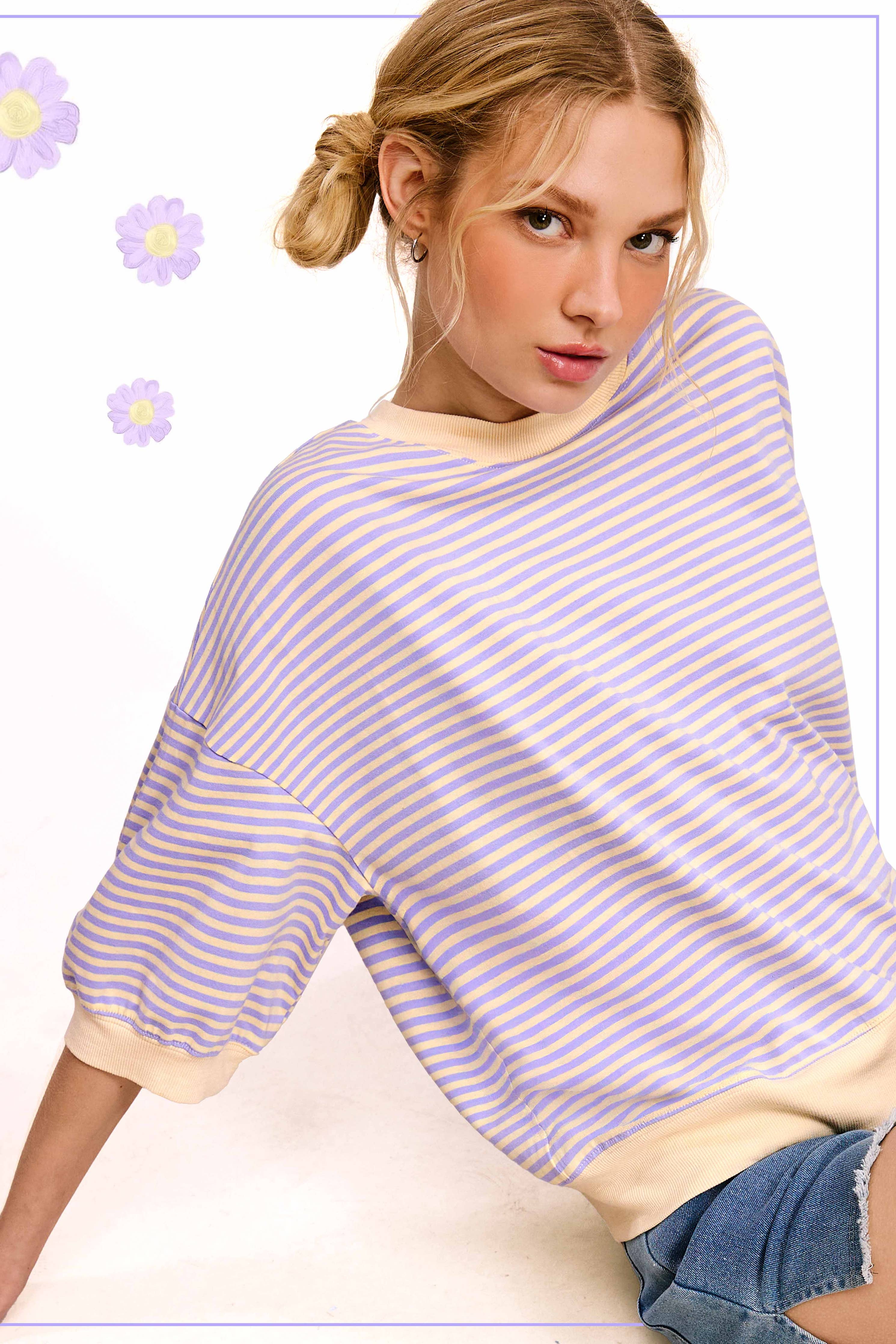 So cool and classic, this timeless crewneck top is featured in an oversized, slouchy silhouette and staple striped print. Lovely for layering or styling solo. Loose fit makes this perfect style for a loungewear too. (Long sleeve version: MCT7678) Perfect with your favorite bottom and shoes for a variety look this season.