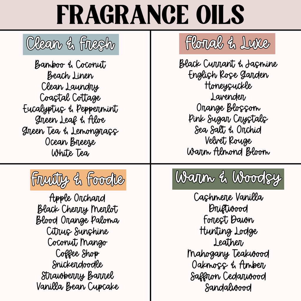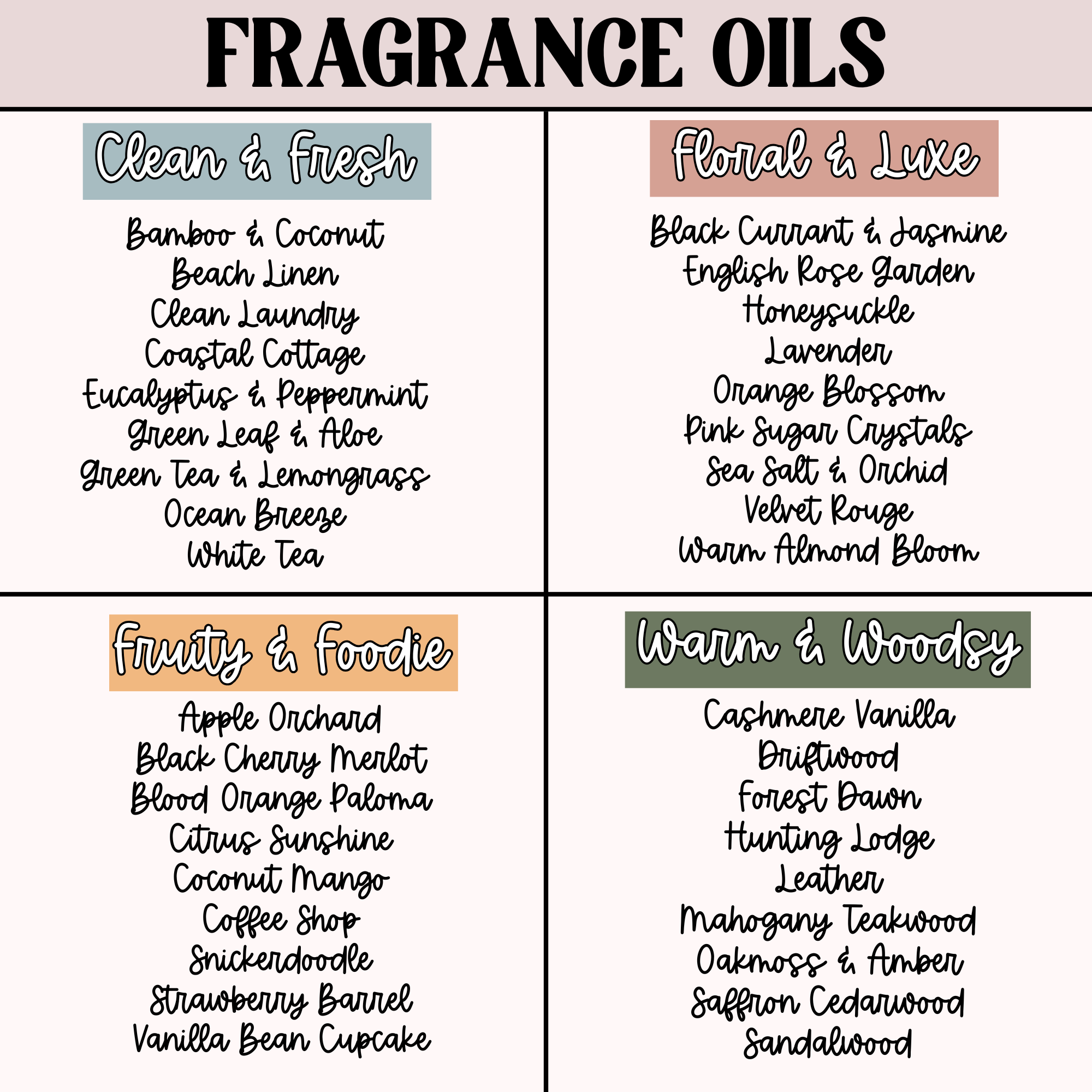Our fragrance oils are clean and free of phthalates, parabens, and any ingredients on the California Prop 65 list.