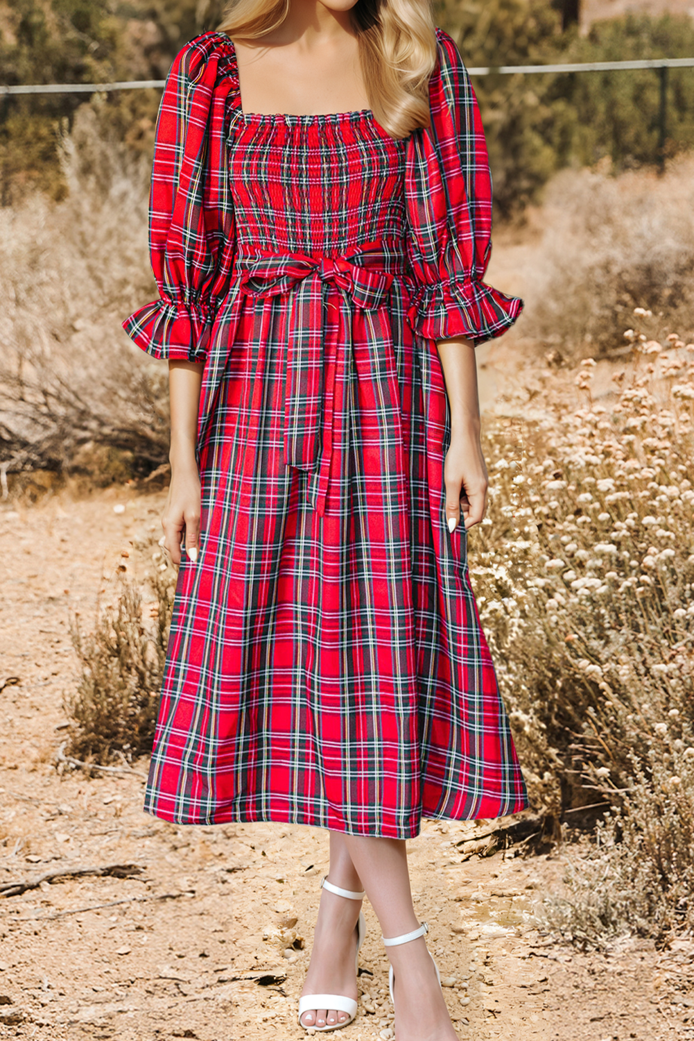 🌺Material: 75%Polyester+25%Cotton 🌺Pattern: Plaid 🌺Neckline: Square Neck 🌺Sleeve: Long Sleeve 🌺Details: Shift 📏Size Chart(INCH) | Size | Bust | Waist | Hem Width | Sleeve Length | Length | |-------|-Relax-|-Relax-|-----Relax-----|-------Relax-------|--Relax--| | S | 30.3 | 27.2 | 84.3 | 20.2 | 46.1 | | M | 32.3 | 29.1 | 86.6 | 20.7 | 46.9 | | L | 34.3 | 31.1 | 89.0 | 21.2 | 47.6 | | XL | 37.0 | 33.9 | 92.1 | 21.7 | 48.4 | Tartan plaid pattern offers timeless holiday style. Square neckline creates a flattering frame for delicate jewelry. Dramatic puff sleeves add romantic volume and statement style. Adjustable knot waist defines the silhouette with feminine flair.