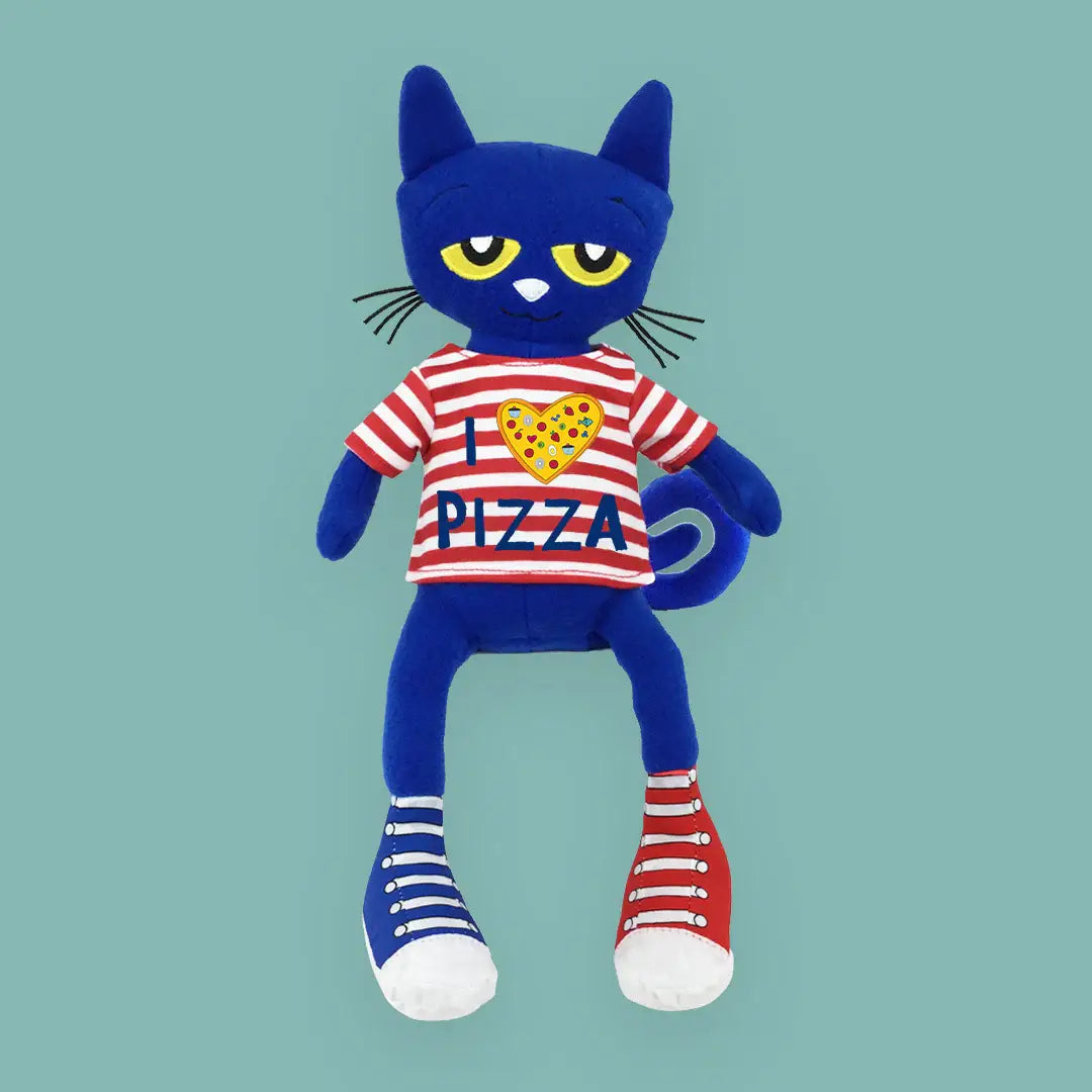 It's a party, a party, a perfect pizza party! What will Pete do when he finds out that his friends all like different toppings on their pizza? This cool cat won't let that ruin his pizza party. Now you can throw your own perfect pizza party with your very own Pete the Cat Pizza Party plush based on the bestselling books by James Dean. Our original-sized Pete rocks his red-striped I LOVE PIZZA shirt and red and blue shoes. He's a cool cat, always ready to make any party groovy. What could be more perfect? A groovy NEW YORK TIMES bestseller from Pete the Cat series, it’s a groovy pizza party that you don’t want to miss! Surface wash only Safe for all ages