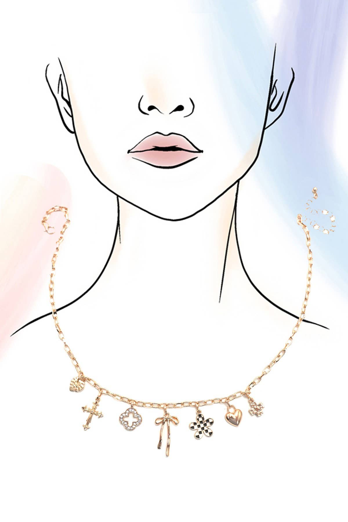 The Charm Necklace Clover, Bow, Checker, Flower, Heart featuring a unique mix of charms including a lucky clover, sweet bow, trendy checker pattern, delicate flower, and romantic heart, this necklace adds a touch of personality and fun to any outfit. Perfect for expressing your style with a mix of cute and meaningful details.