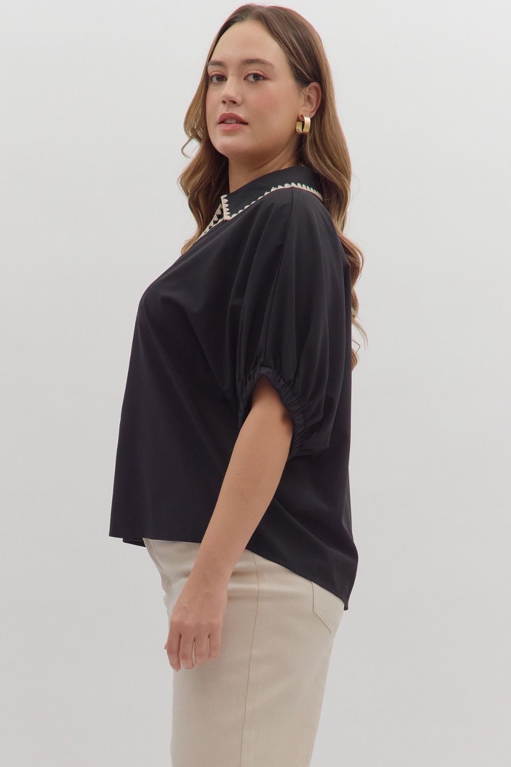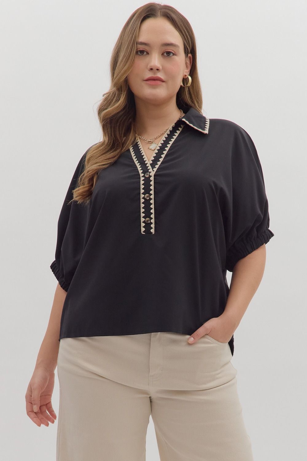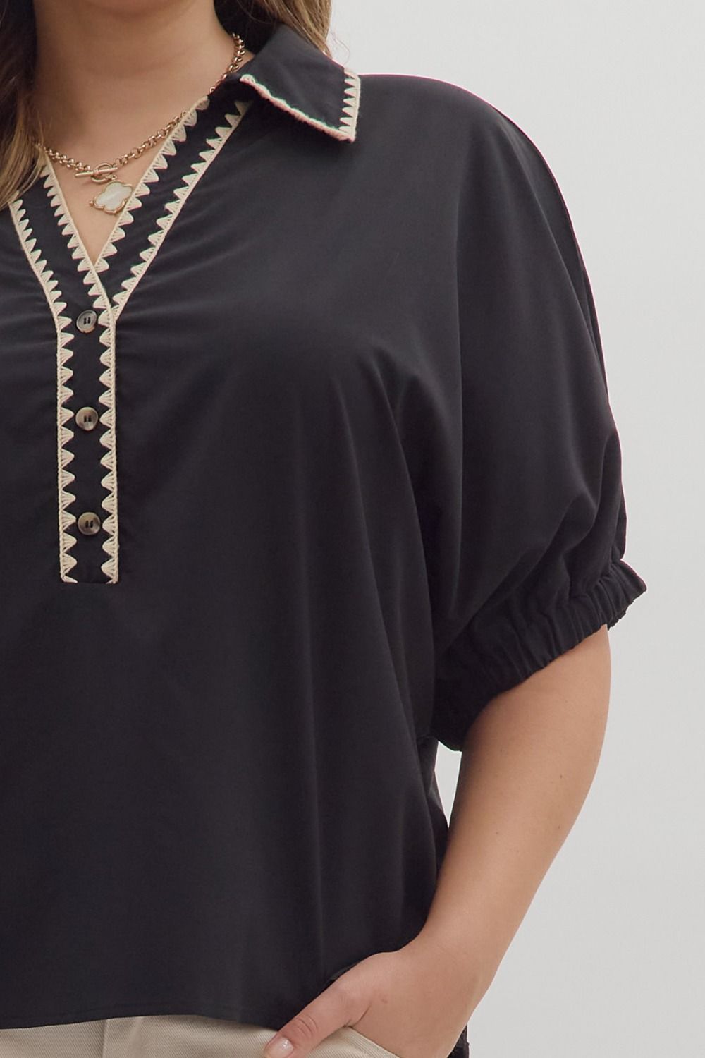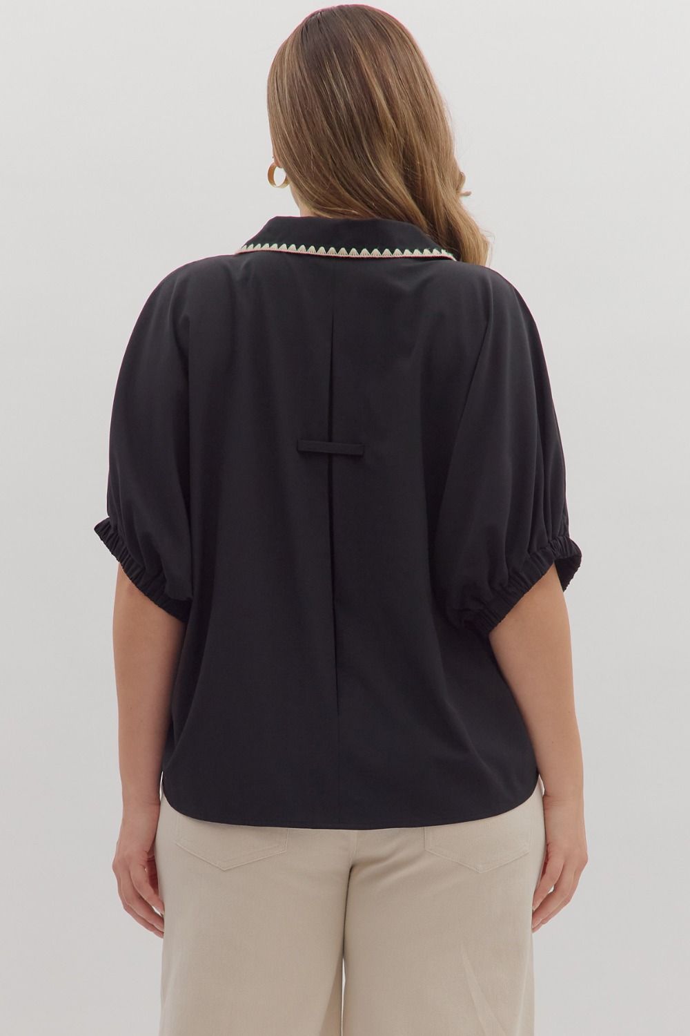 Solid short sleeve top featuring scallop accent trim at collar and front placket. Elasticated sleeve openings. Unlined. Woven. Non-sheer. Lightweight.