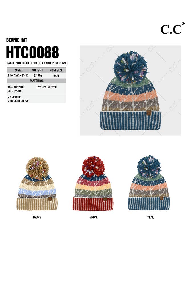 C.C Cable Multi Color Block Yarn Pom Beanie Winter Hat