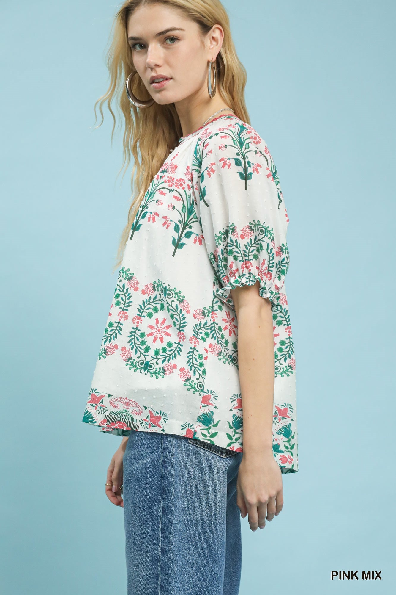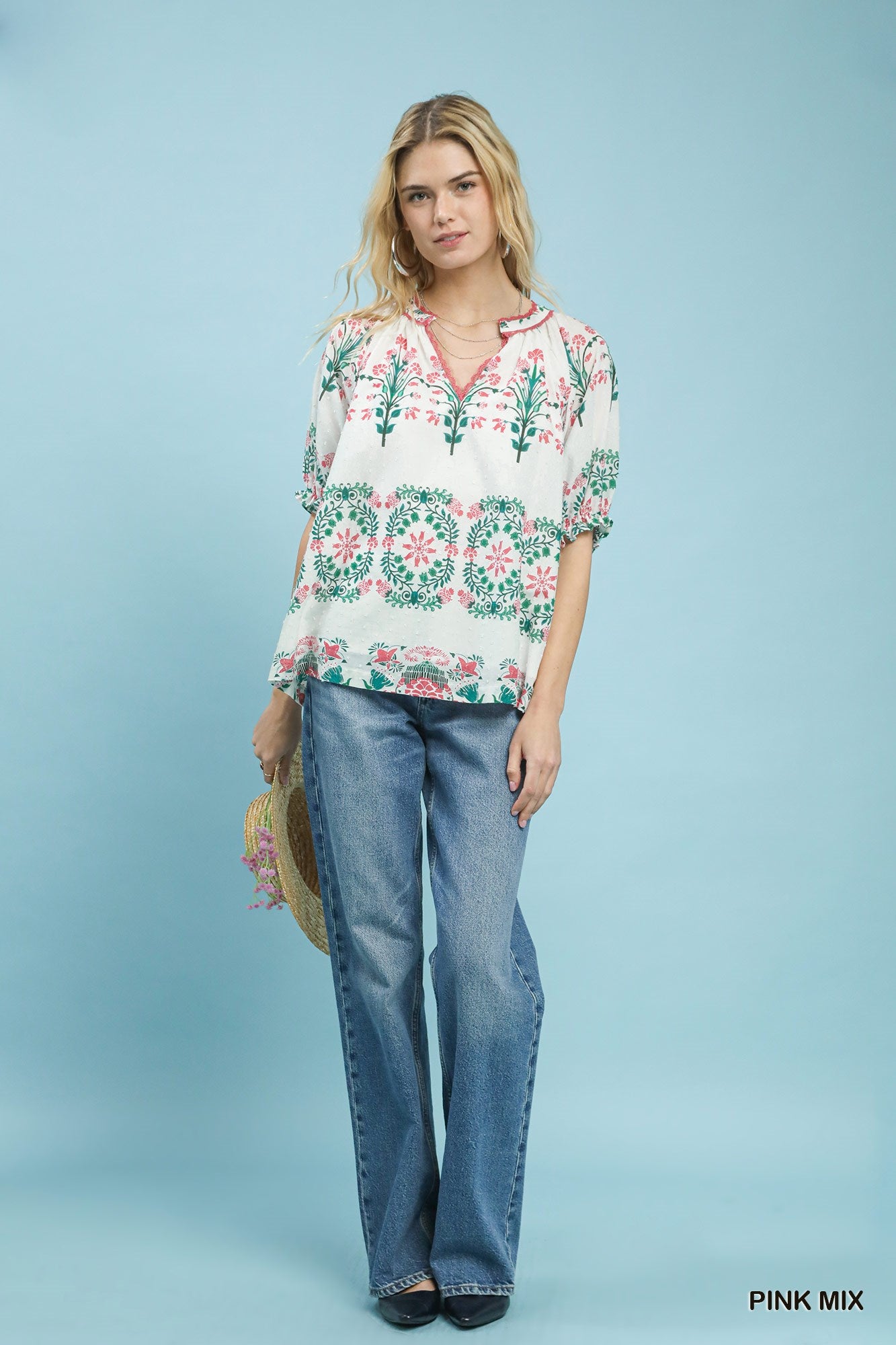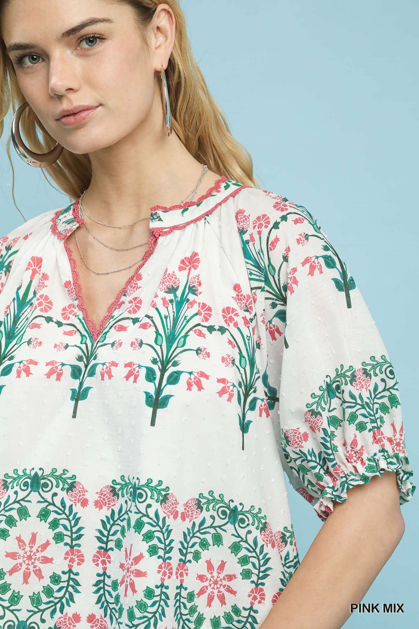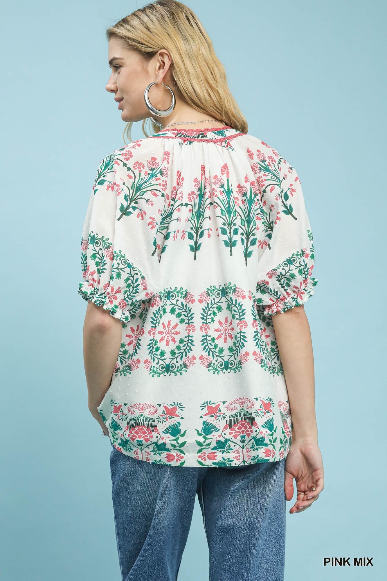 Mix Floral Border Print Split-Neck Boho Top