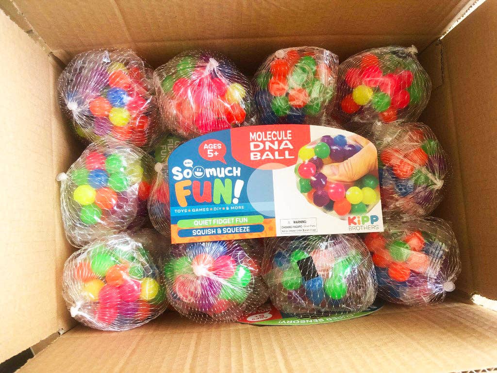 Sensory squishy ball filled with 50 inner soft marble sized balls that squeeze, squish. and slide around. Quiet fidget fun. Balls are individually packaged with a mesh bag and header card. 12 balls per inner box with toy bin card included for use on the So Much FUN! Toy Bin Program corrugated display or in the clear toy bin pockets. Product fits short or tall bins.