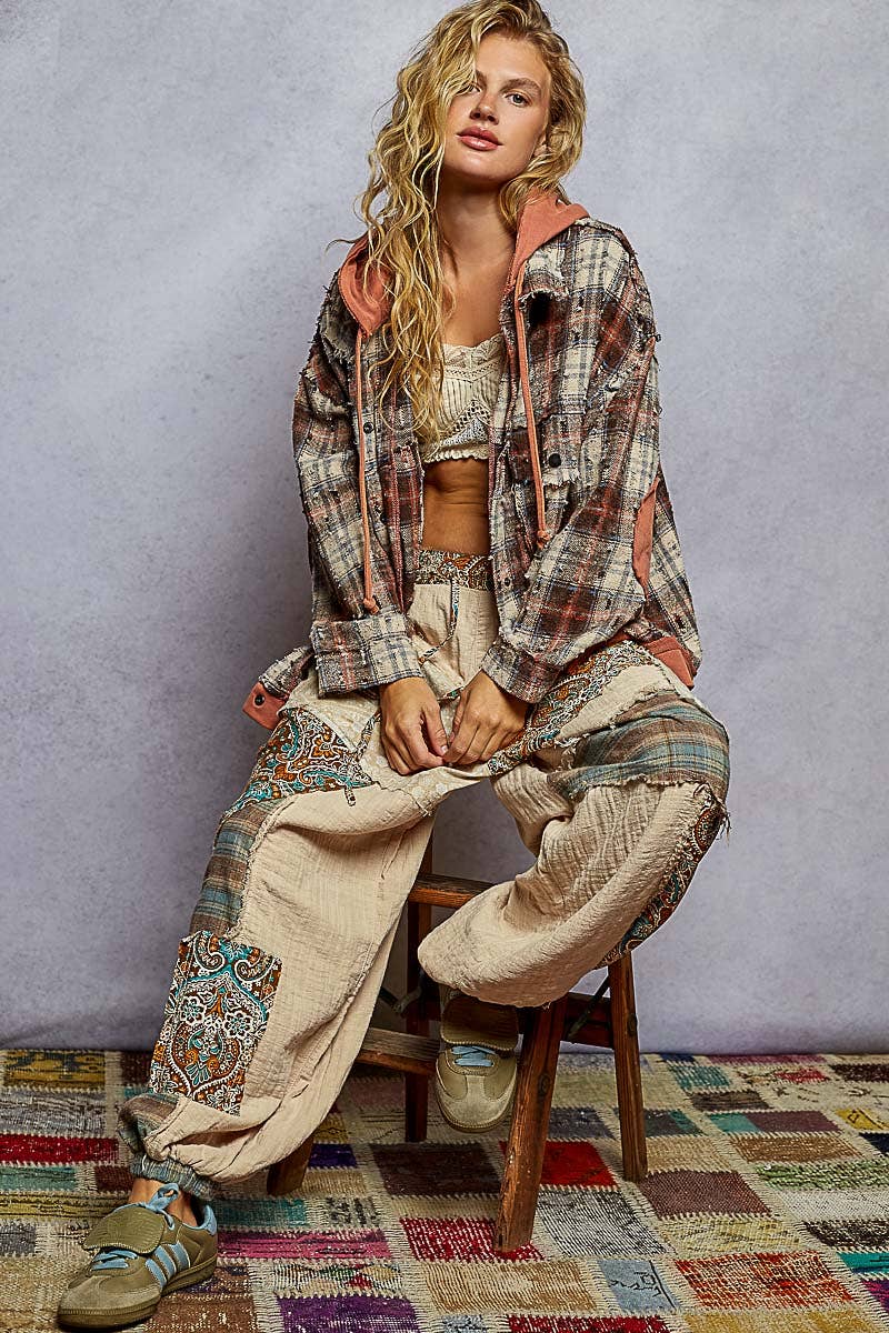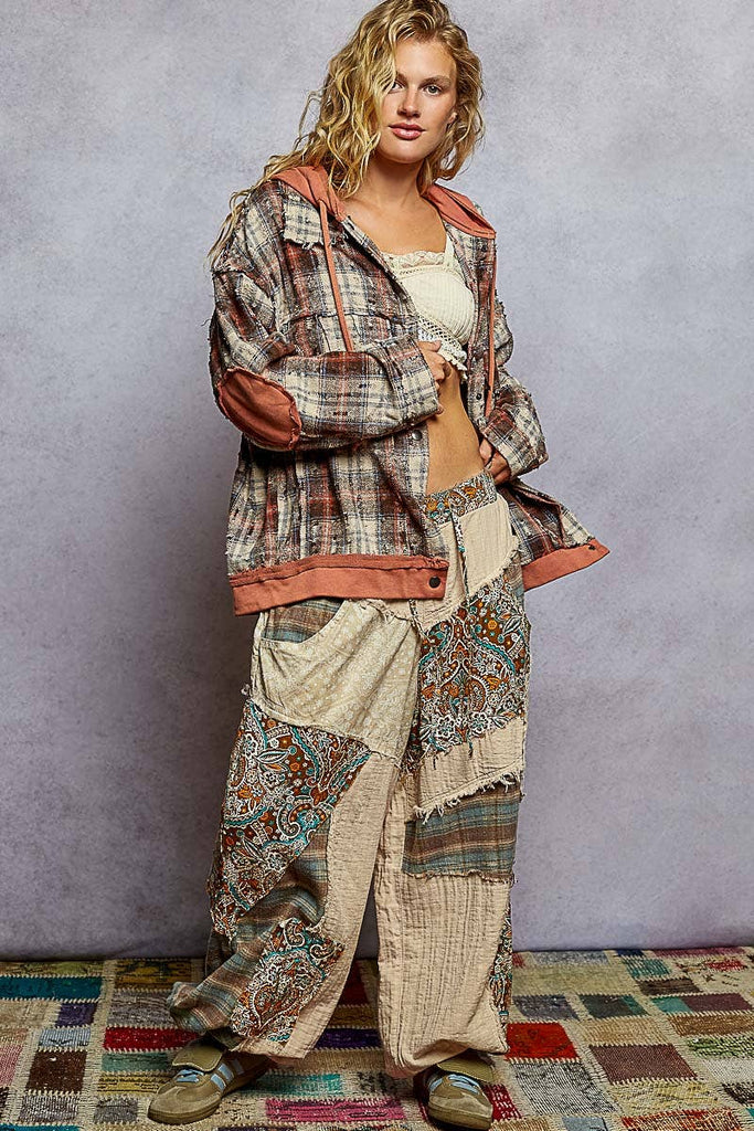 Designed in an oversize fit, hooded, snap button down, chest pocket, raw edge details, opening band and elbow patch, plaid jacket. Specs/Dimensions: - LENGTH: 27-1/2" - BUST: 24"