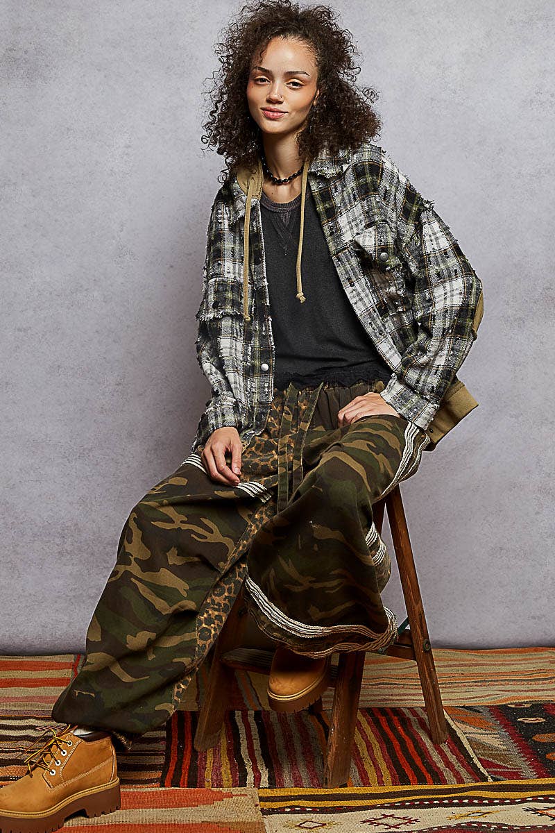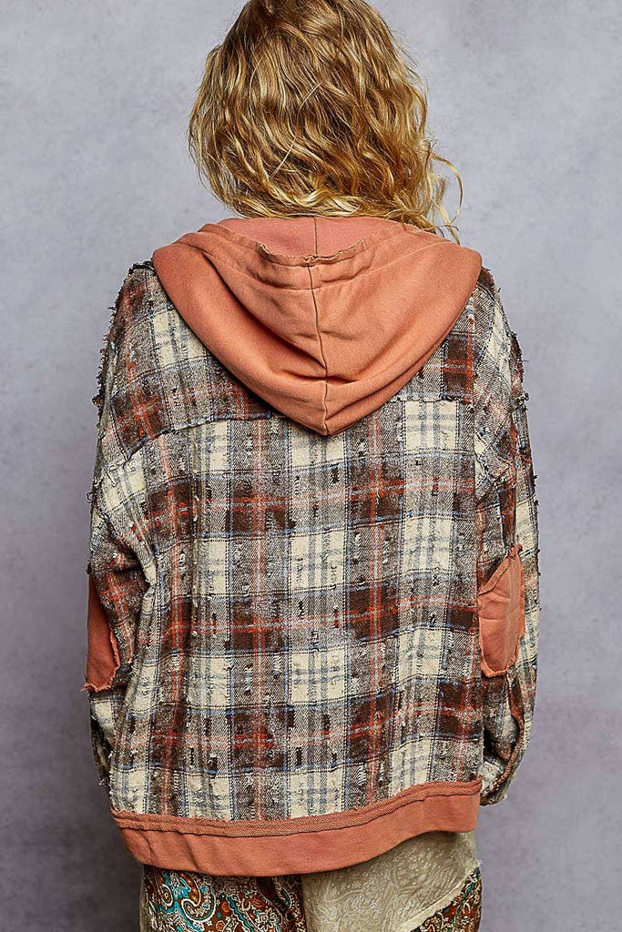 Hooded snap button down plaid jacket