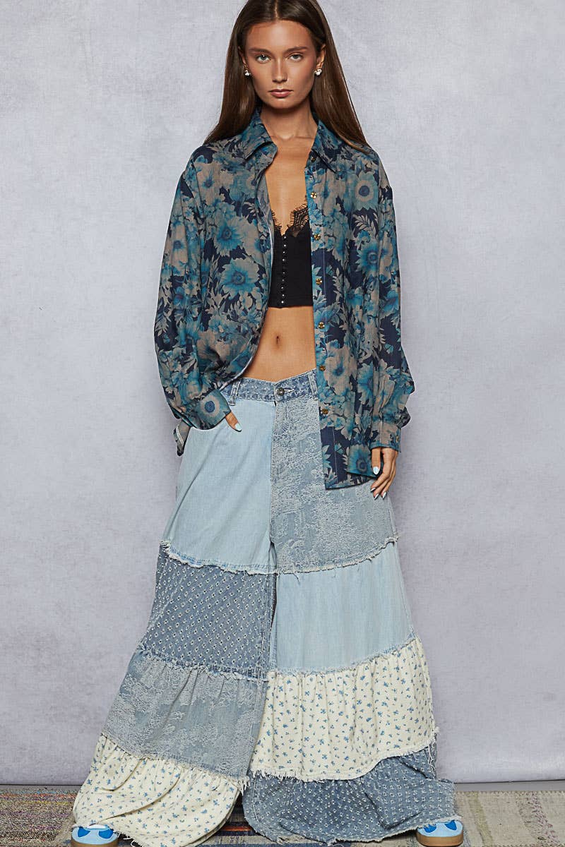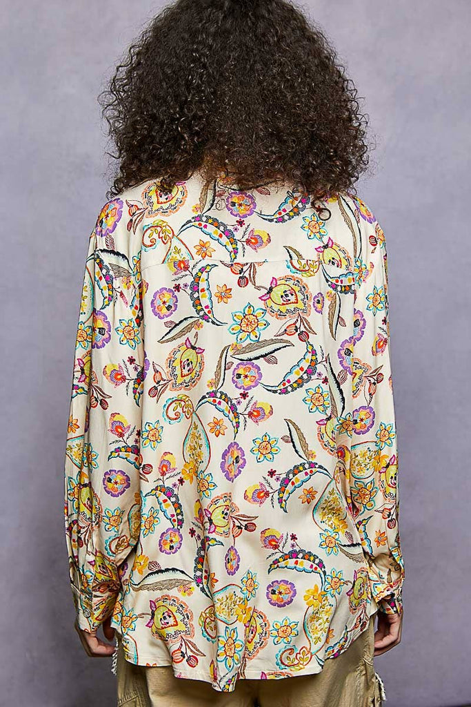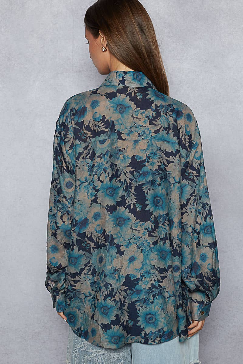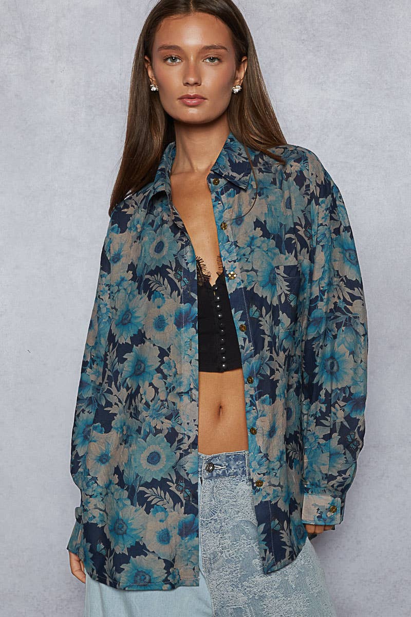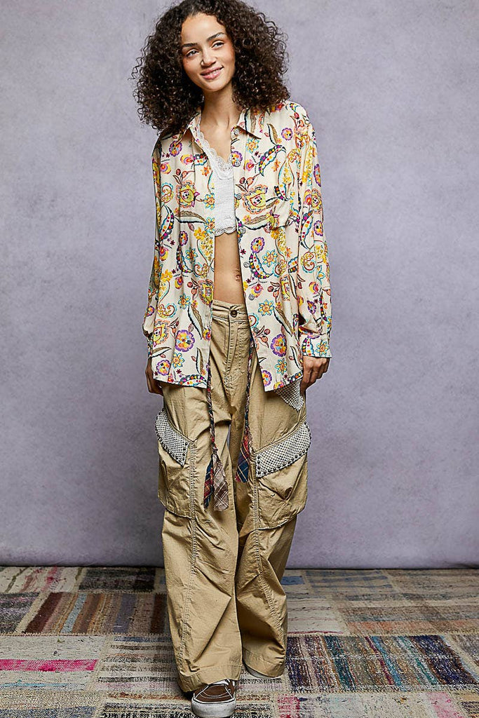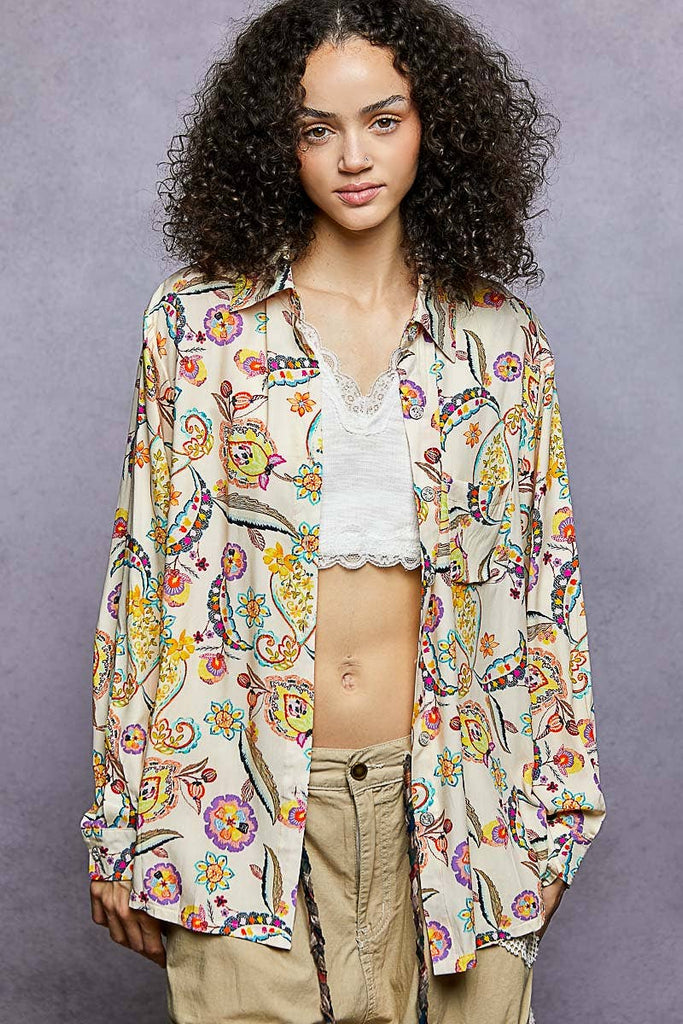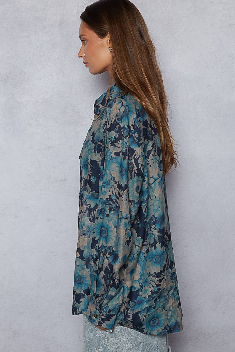 Designed as a long sleeve regular-fit shirt in printed woven fabric, this piece features an allover floral print in vibrant hues, a chest patch pocket, and adjustable cuff detailing. The relaxed silhouette makes it perfect to wear on its own or styled open as a layering piece over tanks and bralettes. Specs/Dimensions: - BUST: 23-1/2" - LENGTH (Front): 29" - LENGTH (Back): 30-1/2" - SLEEVE: 23" - SHOULDER: 18-3/4"