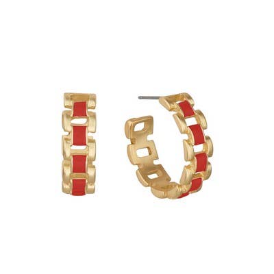 Our Olsen RED Earrings from Meghan Browne Style embody a unique fusion of fashion. These 1/2in Gold Link Earrings are adorned with a sophisticated purple enamel trim, adding a pop of color to your ensemble. The hoops' design is lightweight yet sturdy, providing comfortable wear all day. Meghan Browne Style, established in 2003, has been delivering on-trend styles for over 20 years, and these earrings continue that tradition. Embrace your sense of fashion with these vibrant hoops.