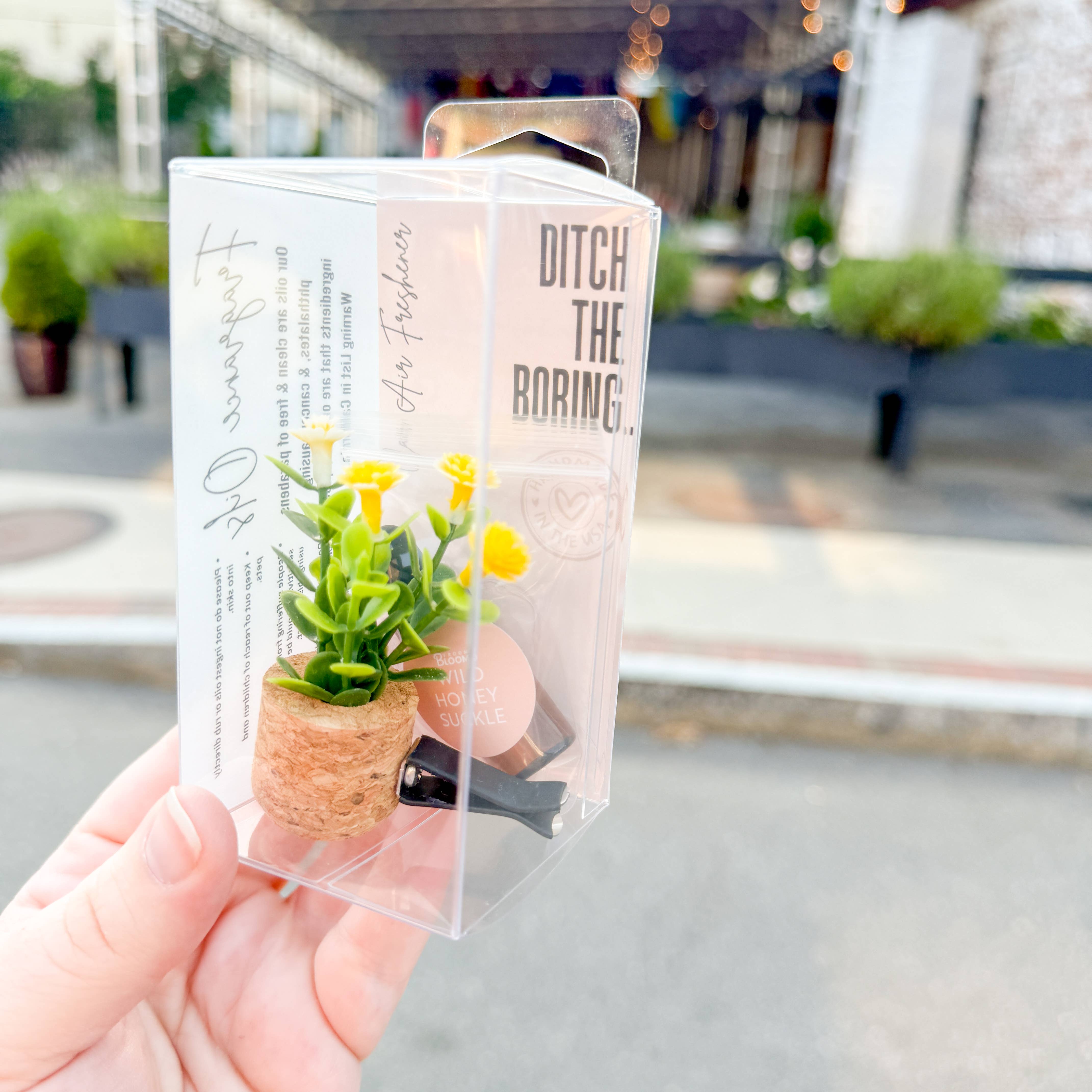One of our owners invented these adorable, reusable plant diffusers as an alternative to traditional car air fresheners that contain chemicals that can be harmful to breathe in. She often got headaches with other air freshener options, plus they were all the same boring plastic design. So, the plant car vent diffusers were born!